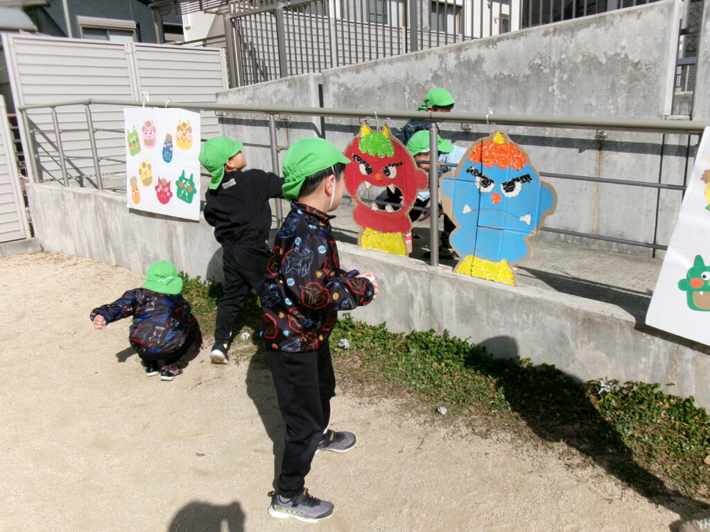 「鬼は外!福は内!」と、保育者と一緒に鬼に向かって豆に見立てた豆を投げていました。