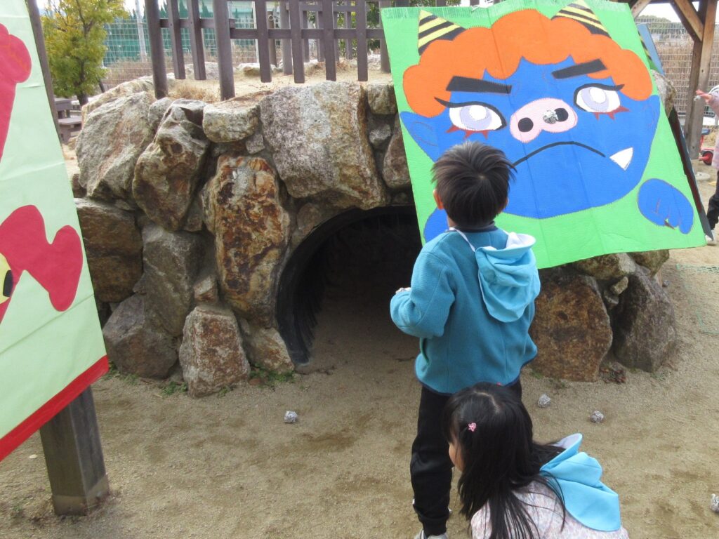 今年も園庭には、石垣に鬼のパネルを置いて『鬼ヶ島』を作りました。