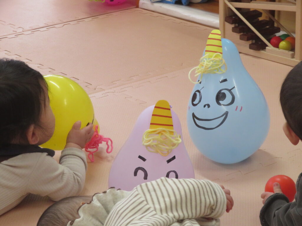 0・1・2歳児の豆まきは、紙を丸めて作った豆や小さいボールを豆に見立てて行いました。