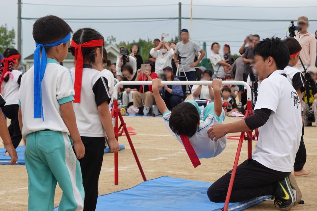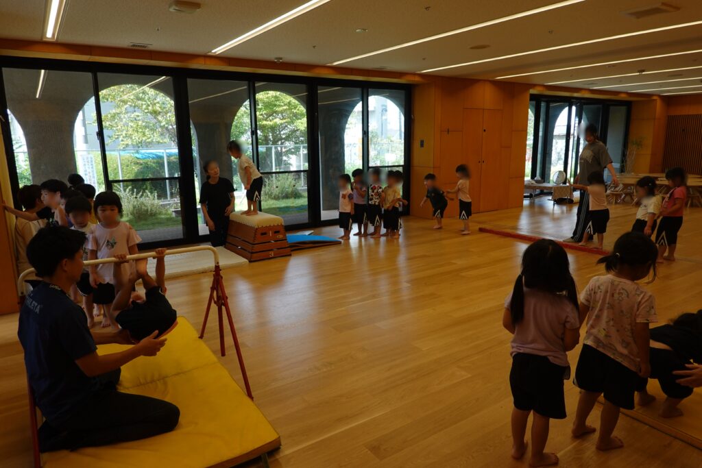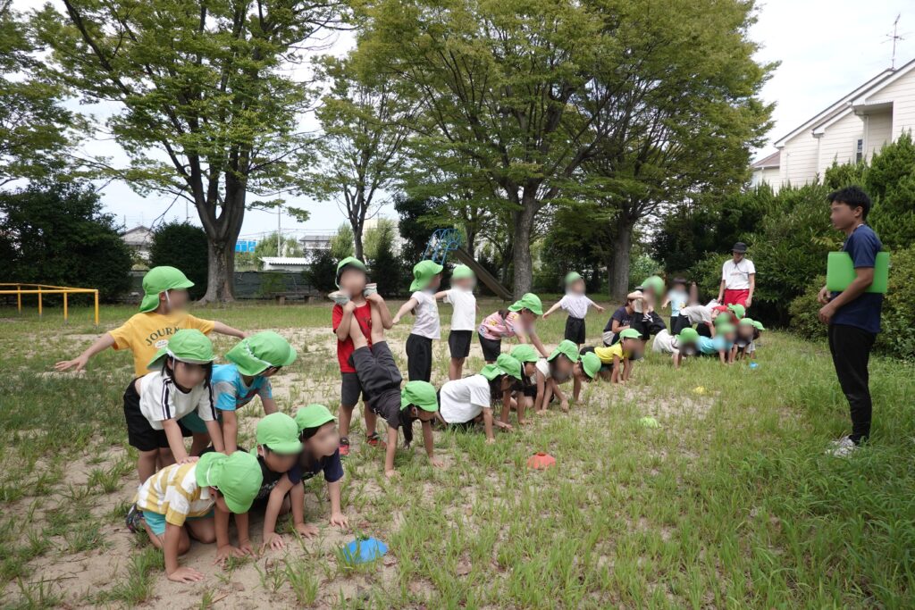 ばらぐみさん(3歳児)は、初めての体育指導の先生とやってきた鉄棒、跳び箱チャレンジしました!少し怖いなーと感じてるお友だちも、がんばりました。おうちの人とのしっぽ取り競技も、とても楽しそうでした。