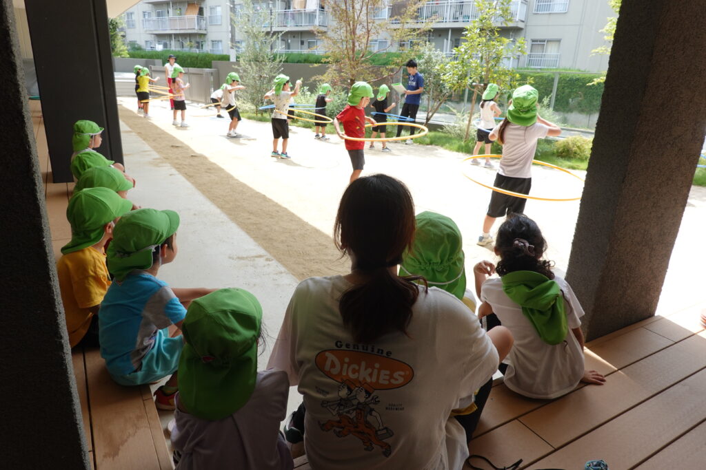 今年度は、2.3.4.5歳児、東山グラウンドでの運動会でした。昨今の暑さ考慮し、0.1歳児は、先日、新園舎での屋内で❜うんどうあそび❜を開催しました。