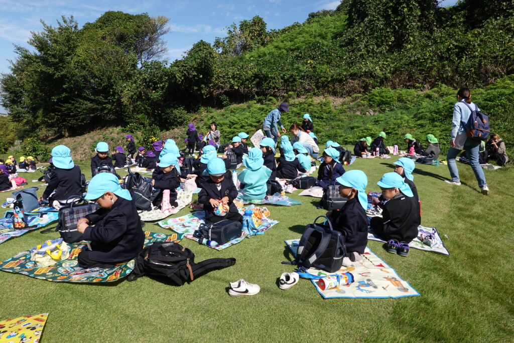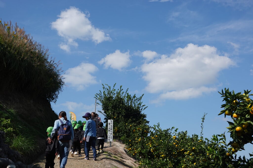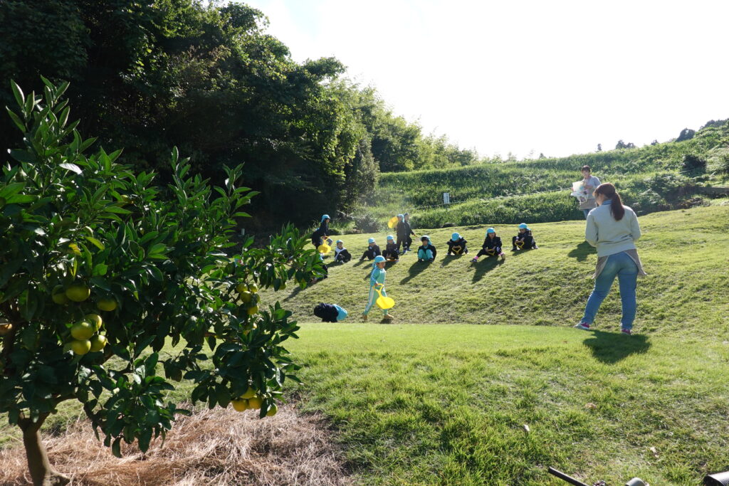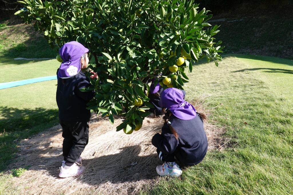 みかんの木を真ん中に”かくれんぼ”始まりました。みかんもたくさんいただいていましたが、みかんの木の間を潜ったり、周りを走り回ったりとても楽しいみかん狩りになりました。おうちから持ってきたお弁当をとても楽しみにしていて「はやくたべた~い!」と、みかんを食べながら言葉にしていました。