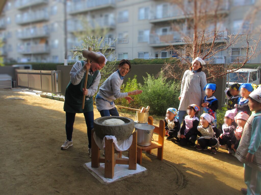 新園舎にて初めての餅つきを、行いました。0歳児から5歳児までみんな揃って楽しみました。もち米をレオックさん(給食場の先生)に蒸してもらい、臼にいれました。職員交代で、臼いっぱいのもち米を、おもちの状態になるまで搗きました。「ぺったん、ぺったん!」と掛け声をかけてくれるかなと思いきや、どこからともなく「よいしょっ、はい!よいよい!」「よいしょっ、はい!よいよい!」と今の時代に乗っている子どもたちのようです。YouTubeで流れている動画のフレーズのようです。乳児クラスの子どもたちは、「よいしょっ!よいしょっ!」「ぺったんぺったん!」とかわいい掛け声で応援しながら餅つきの様子を見ながら楽しんでくれていました。お正月まで他にも楽しい催し物がありますが、お餅つき・お正月など日本ならではの伝統行事を受け継いでいってもらいたいものです。お部屋でも餅つきごっこを行ったりします。