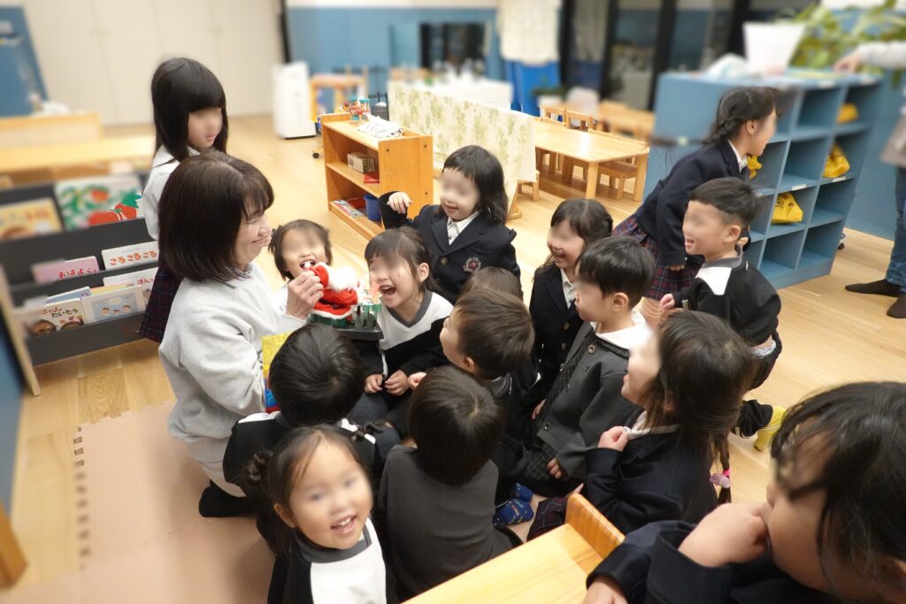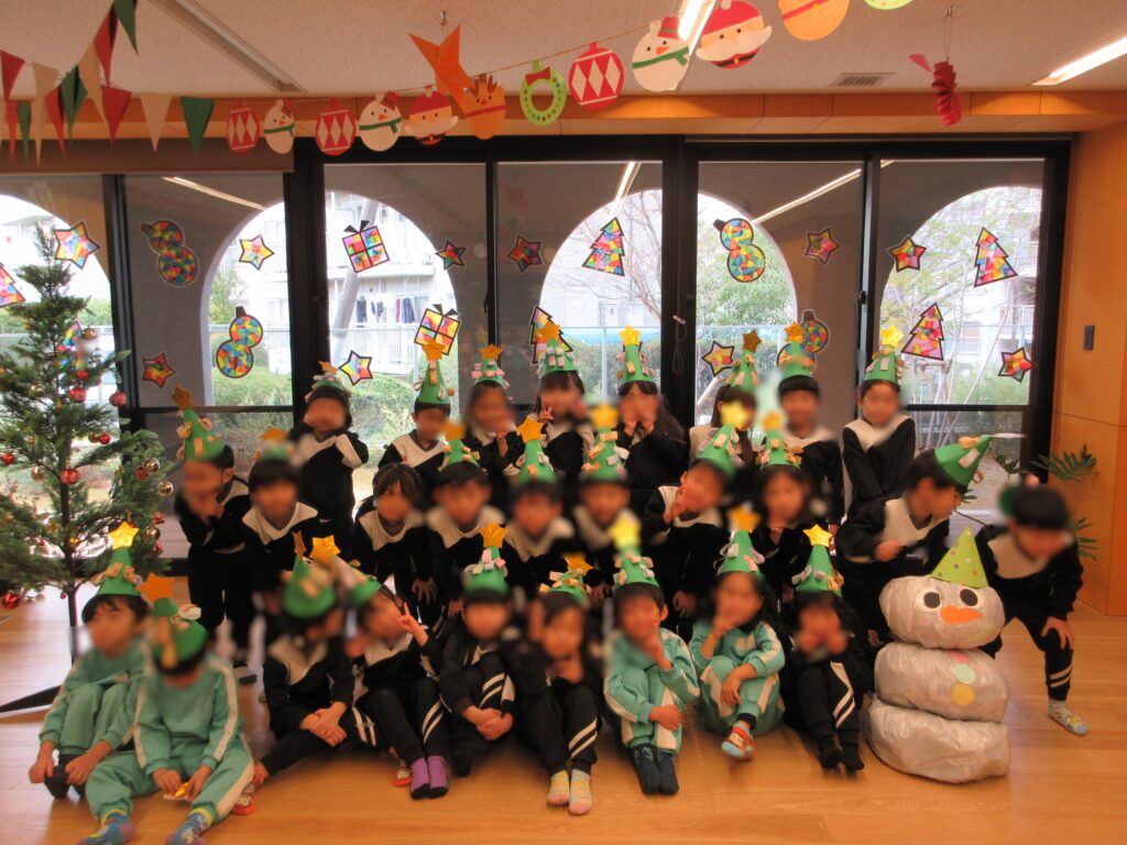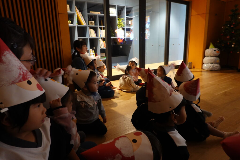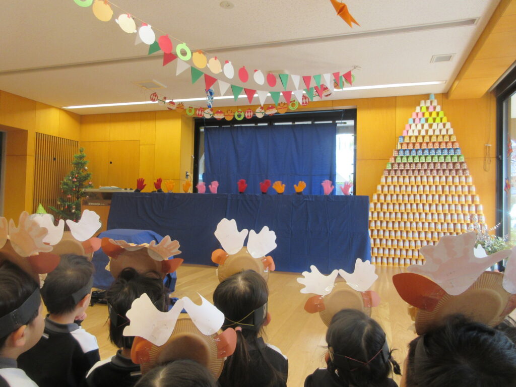 今日のクリスマス会を、子どもたちは随分と前から心待ちにしている様子でした。クリスマスソングをお部屋で歌ったり、とんがり帽子を作ったり、トナカイさんのバッグを、作ってもらい喜んだり、園舎内がクリスマス装飾で飾られてきて気分も上々に盛り上がってきました。今朝の登園時は、クリスマスソングのBGMが流れていて、保護者の方々もとてもうれしそうに出勤されている様子でした。