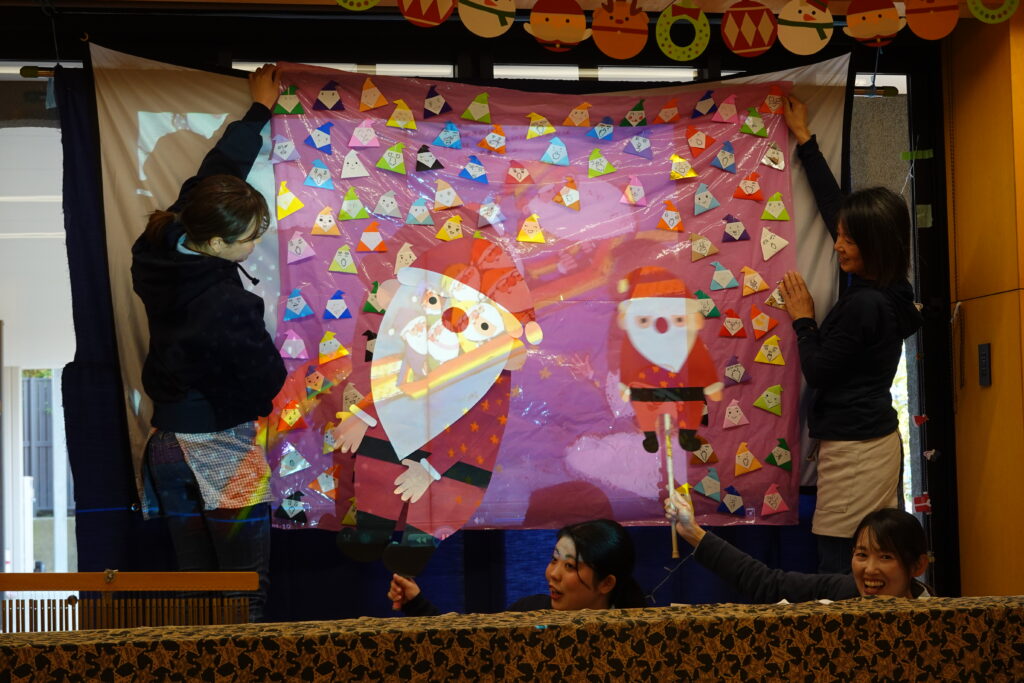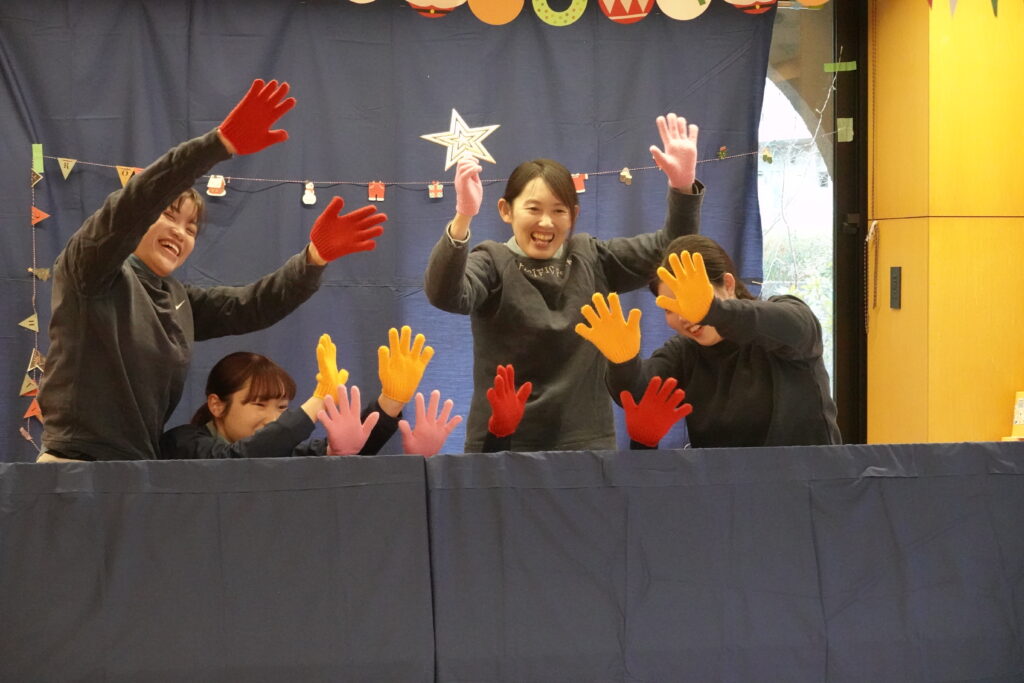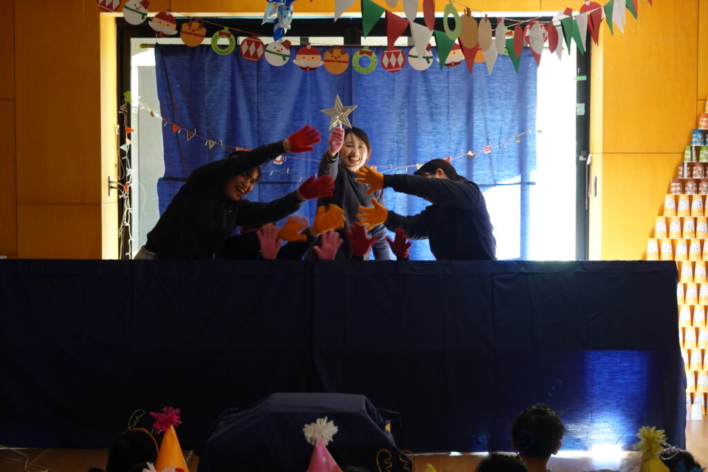 ジングルベルの曲に合わせて職員6名が、手のひらで表現しました。最後はクリスマスツリー🎄ができあがりました。3・4・5歳児の子どもたちは、もう一度見たいとアンコールの声が聞こえ大変盛り上がりました。