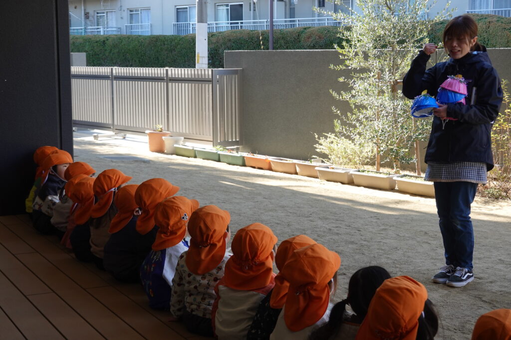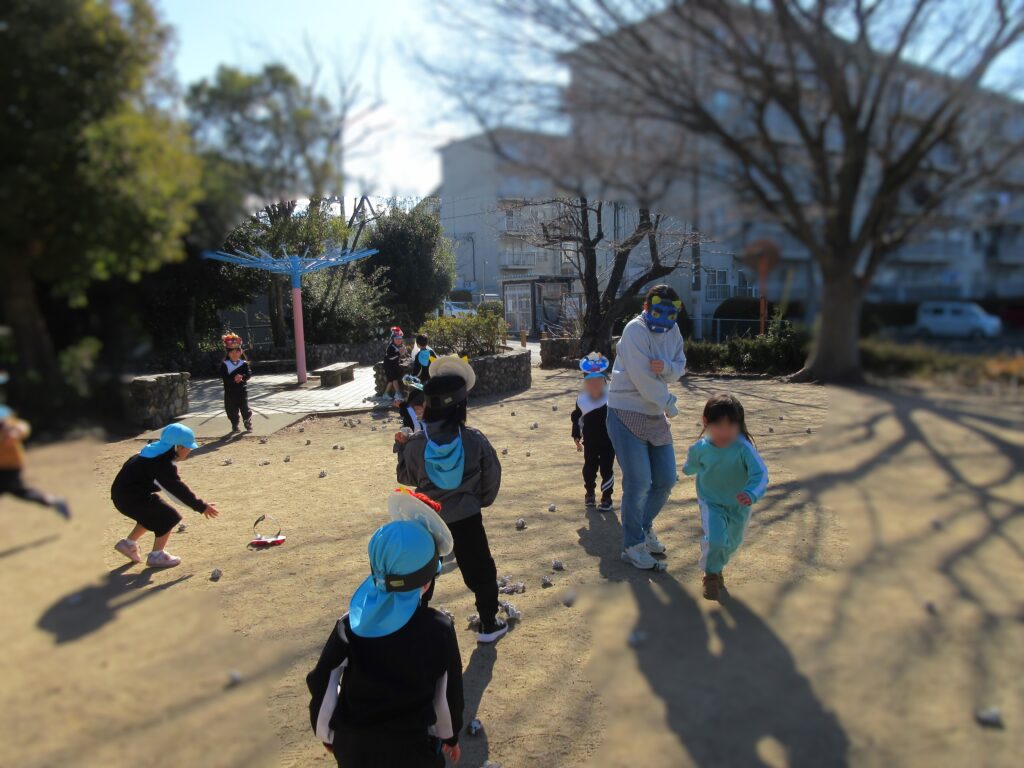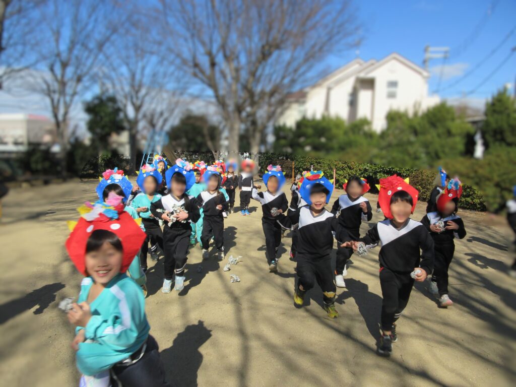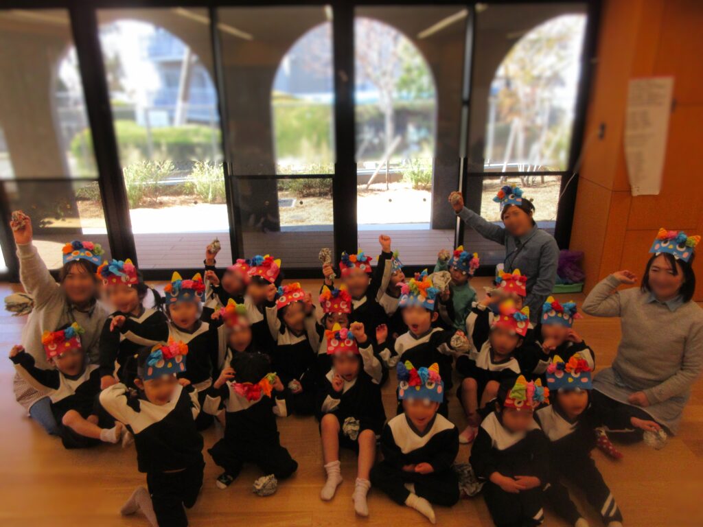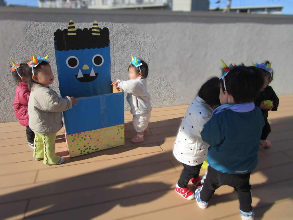 あっという間に2月のカレンダーに変わりました。1月は、冷え込む日もありましたが、朝の体操・マラソンもし、また近くの公園にも遊びに行き元気いっぱいすごしていました。お熱が出たり少し体調崩れたお友だちもいましたが、元気に復活して登園してくれています。節分は、春の始まりである立春の日の前日で冬と春の季節を分ける節目の日です。