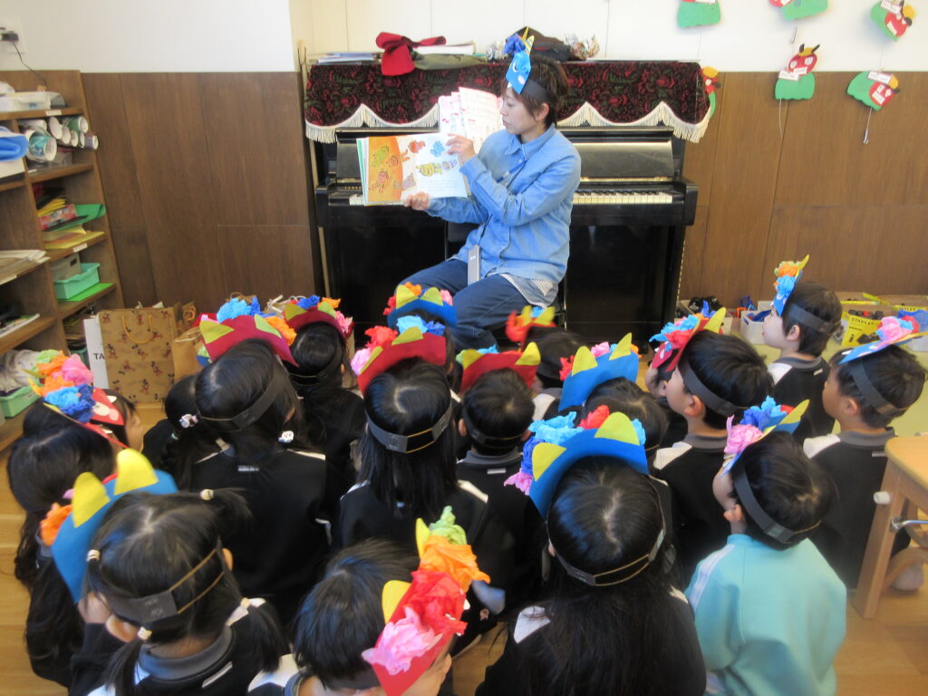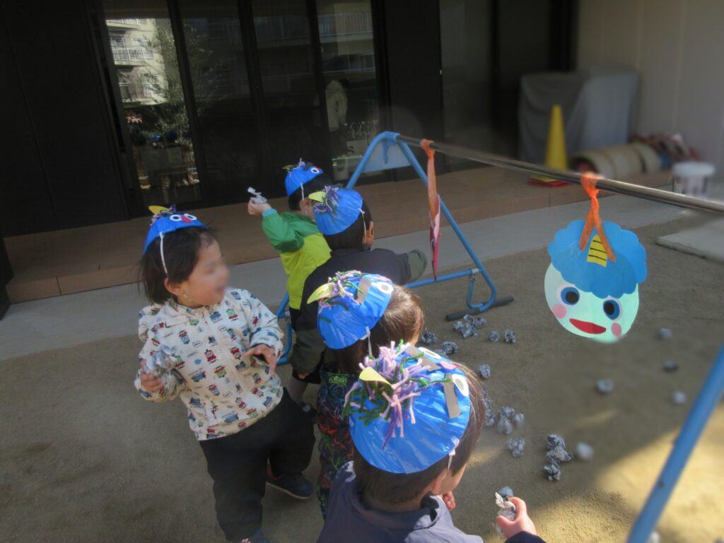 自分のおなかの中に住んでいる鬼さんを追い出そうという絵本を読みました。そのあと豆にみたてた丸めた新聞紙を投げて豆まきをしました。