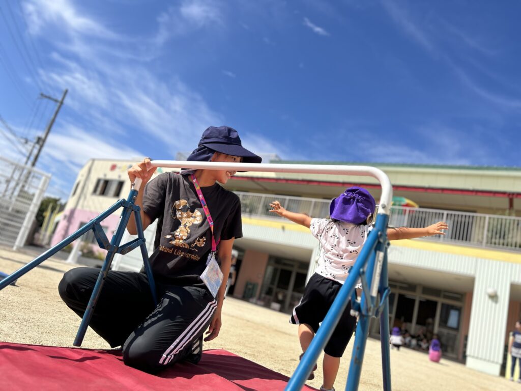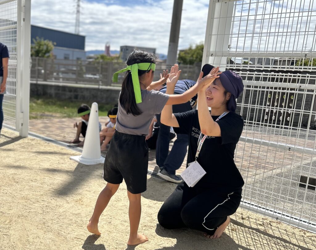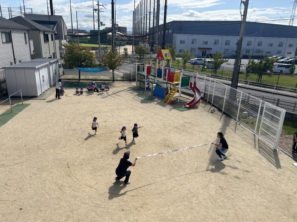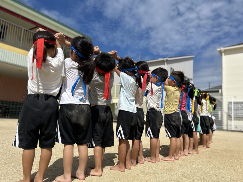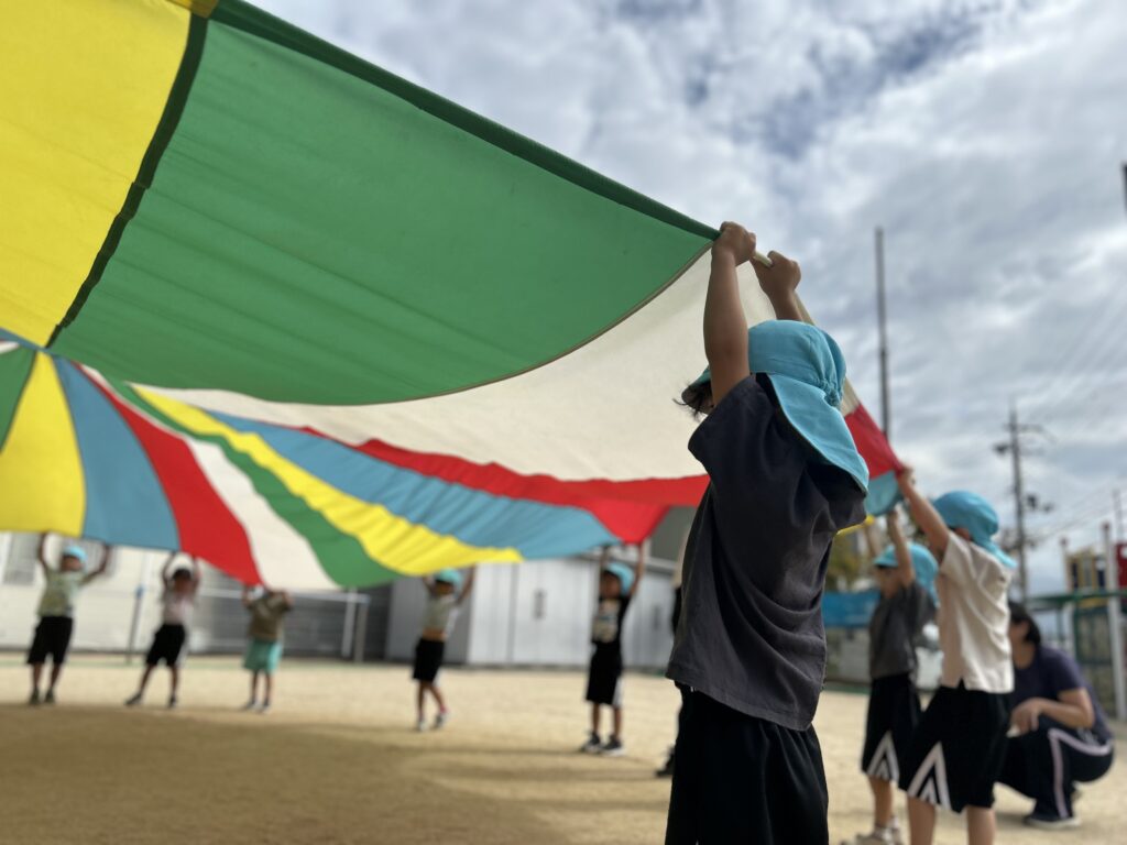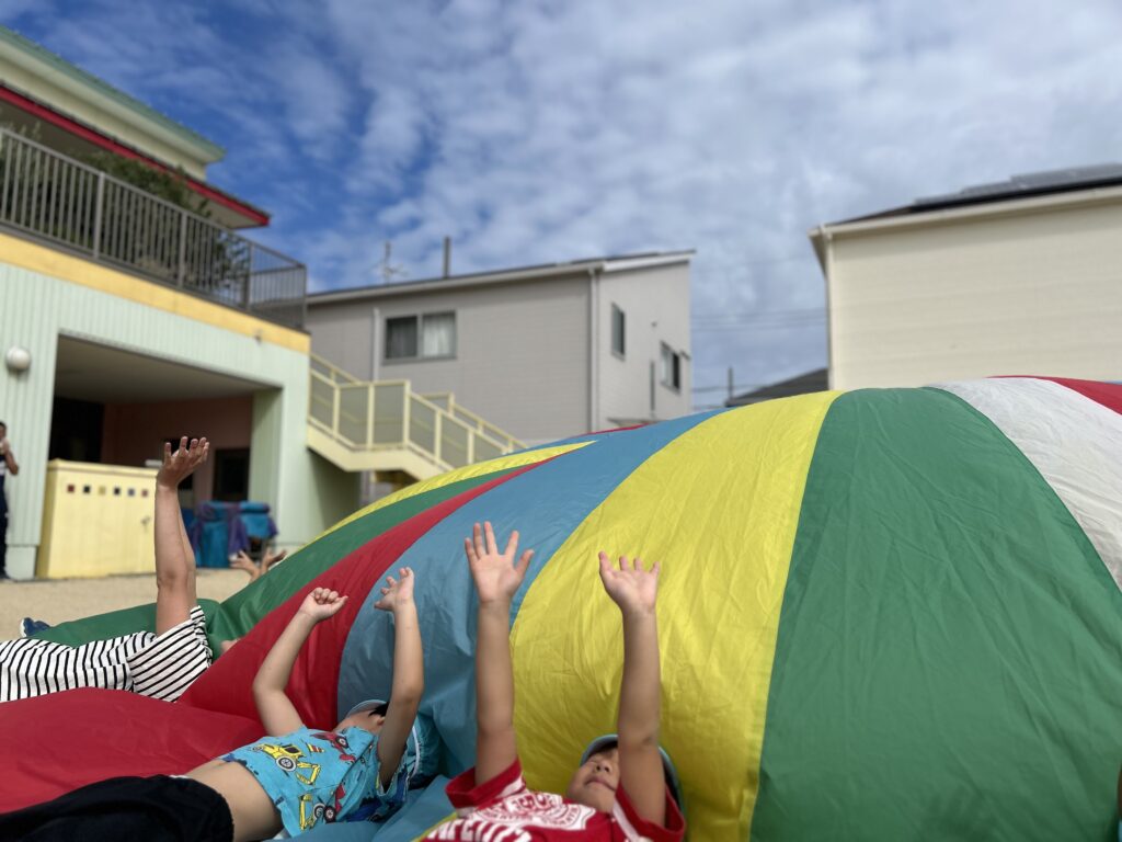 2025.09.25 3歳4歳5歳行事 運動会まであと少し! 秋の風が少しずつ心地よくなってきた園庭。今日は運動会に向けてのリハーサルです。まだ青いレモンのように初々しい子どもたちの姿が当日への期待がふくらみます。 小さな足で、ゴールテープを目指してまっすぐに走る年少さん。友だちといっしょに頑張る姿は、見ている私たちにも力をくれます。 鉄棒で足抜き回りに挑戦してポーズ!音楽に合わせて楽しそうに踊る子どもたち。できることが増え、自信に満ちた表情がキラキラ輝いていました。 青い空の下、色とりどりのバルーンが大きく広がります。息を合わせて引っ張ったり持ち上げたり、仲間と力を合わせる楽しさを体いっぱいに感じていました。 両手を思いっきり上げる子どもたち。友だちと一緒だからこそ、がんばれる力が湧いてくるようです。 はちまきを結んだ年長さん。ひとりひとりの真剣な表情と、仲間と心をひとつに挑む姿がとても頼もしく見えました。 演技を終えた後、担任の先生とハイタッチ!達成感と安心の笑顔がはじける瞬間でした。当日は、今日の練習以上に大きく成長した姿を見せてくれると思います。保護者の皆さまも、ぜひ楽しみにしていてください。 一覧へ戻る