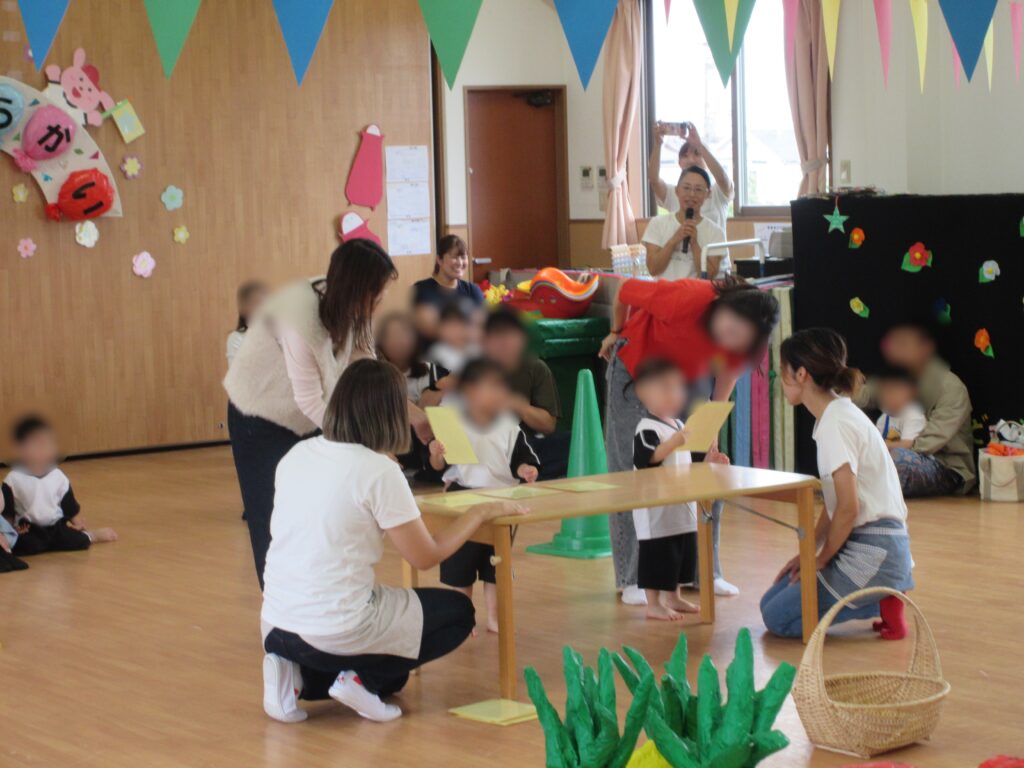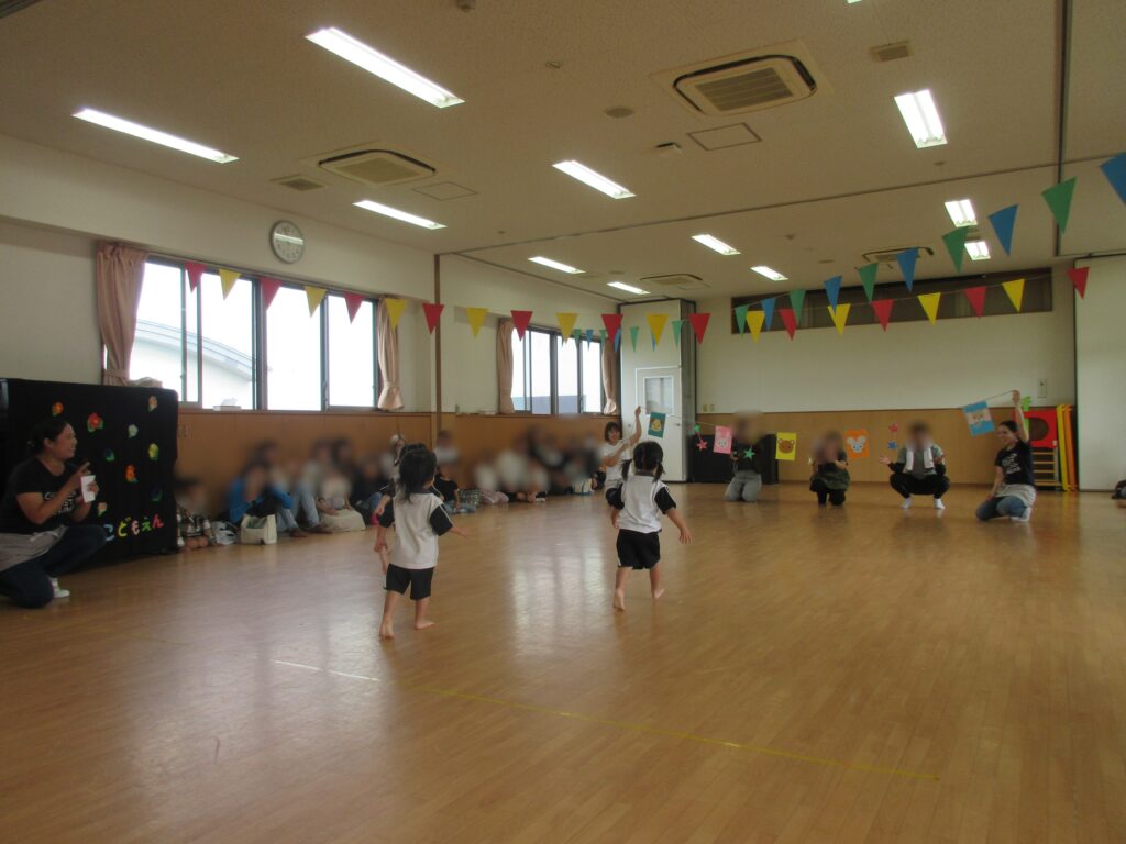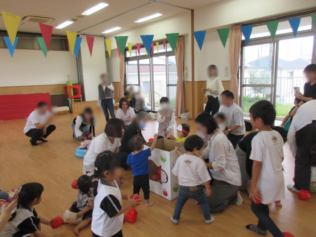 歩いたり、ハイハイをしたり、お家の方と一緒に玉入れを楽しみました!