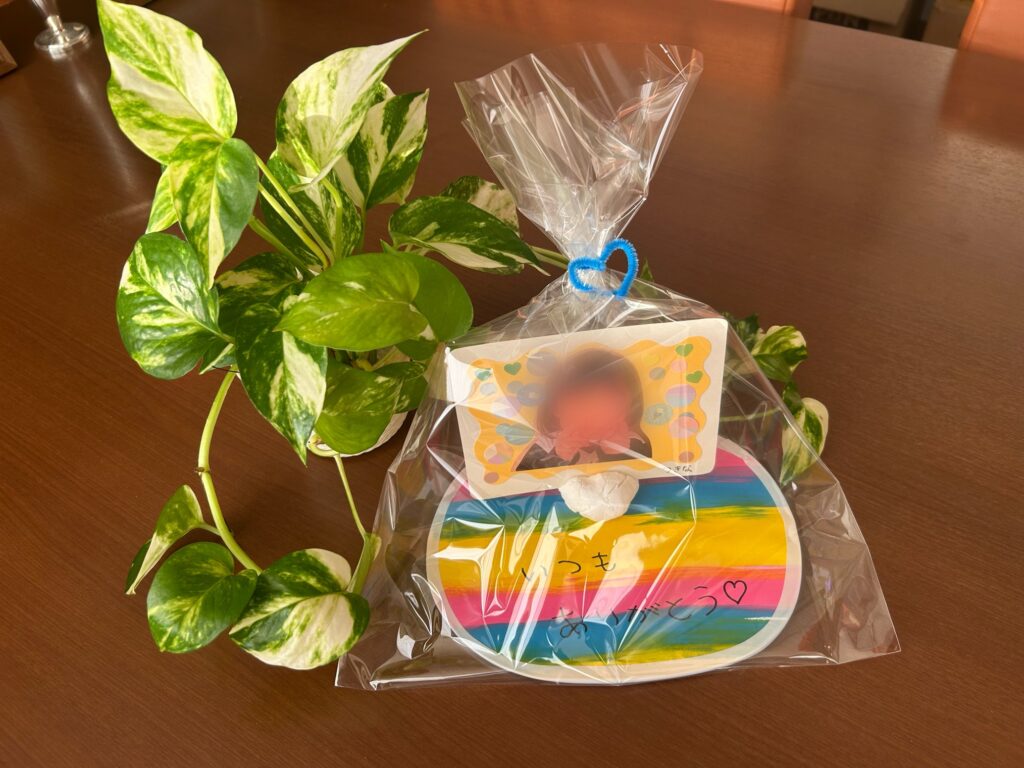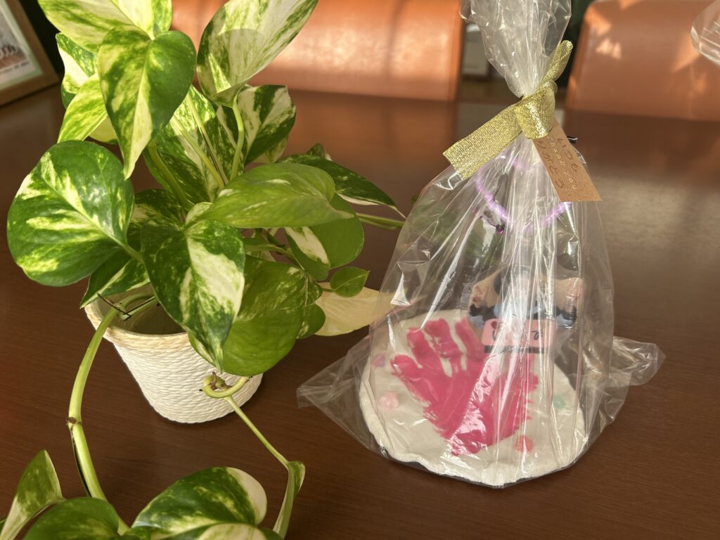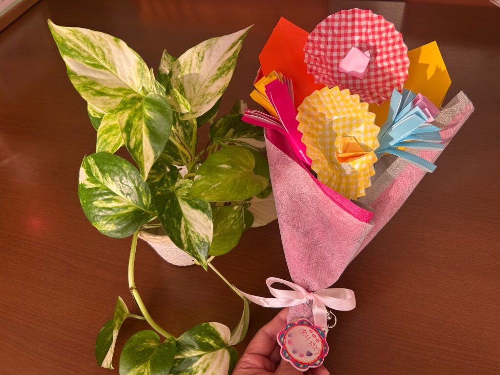 花束をイメージしたブーケに、子どもたちの言葉を添えたメッセージキーホルダーがついた作品♡