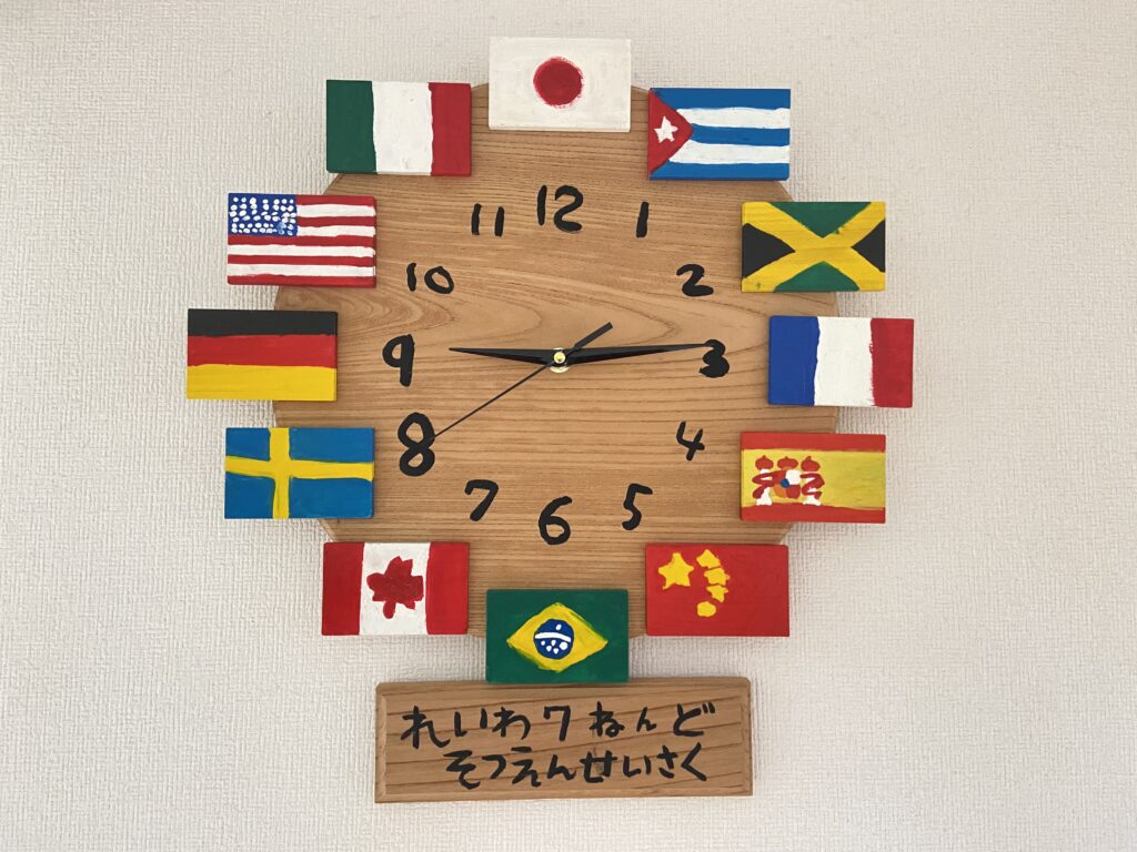 さまざまな国に興味を広げながら、子どもたち一人ひとりが想いを込めて作り上げた“国旗の時計”。