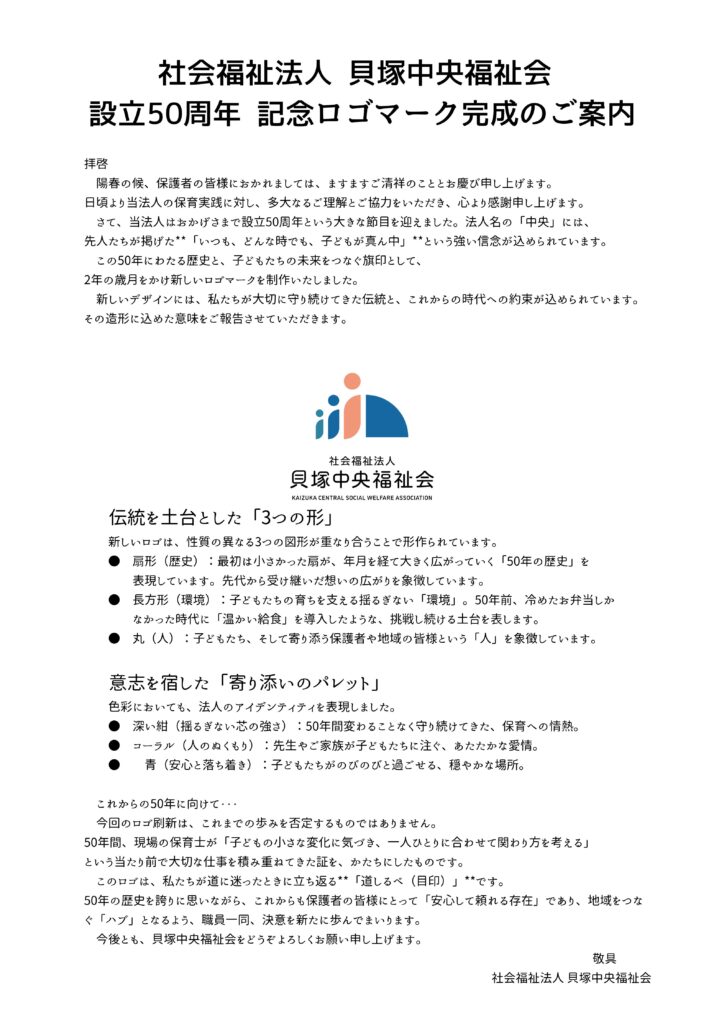 いつも社会福祉法人 貝塚中央福祉会の保育に、あたたかいご理解とご協力をいただき、ありがとうございます。