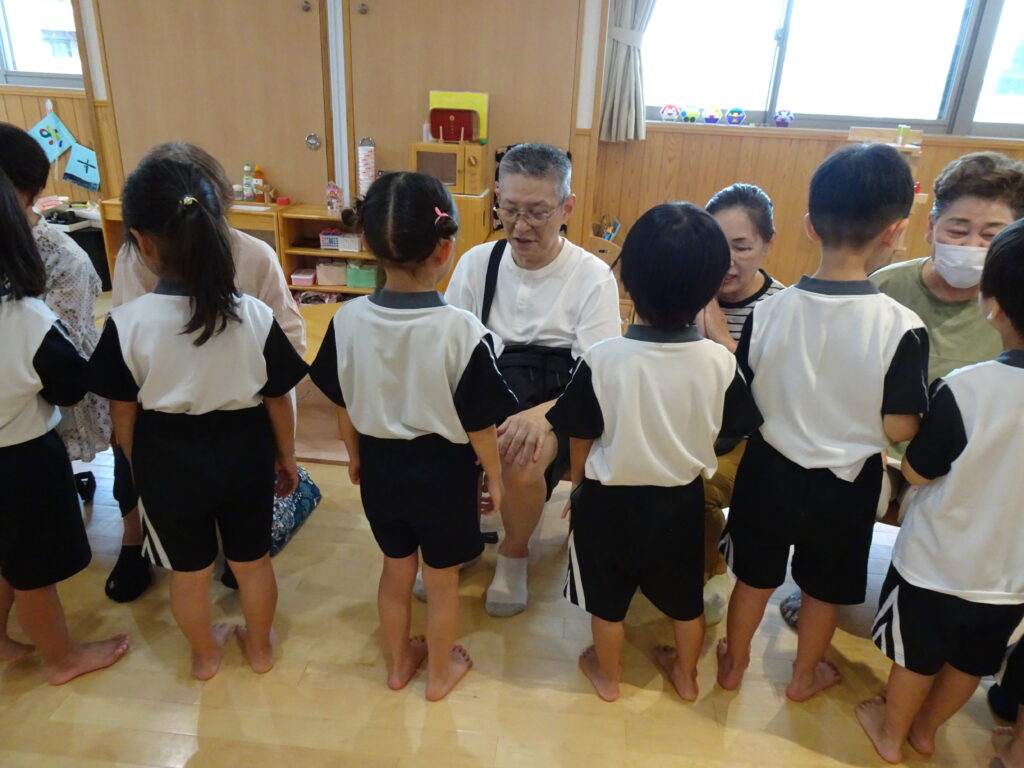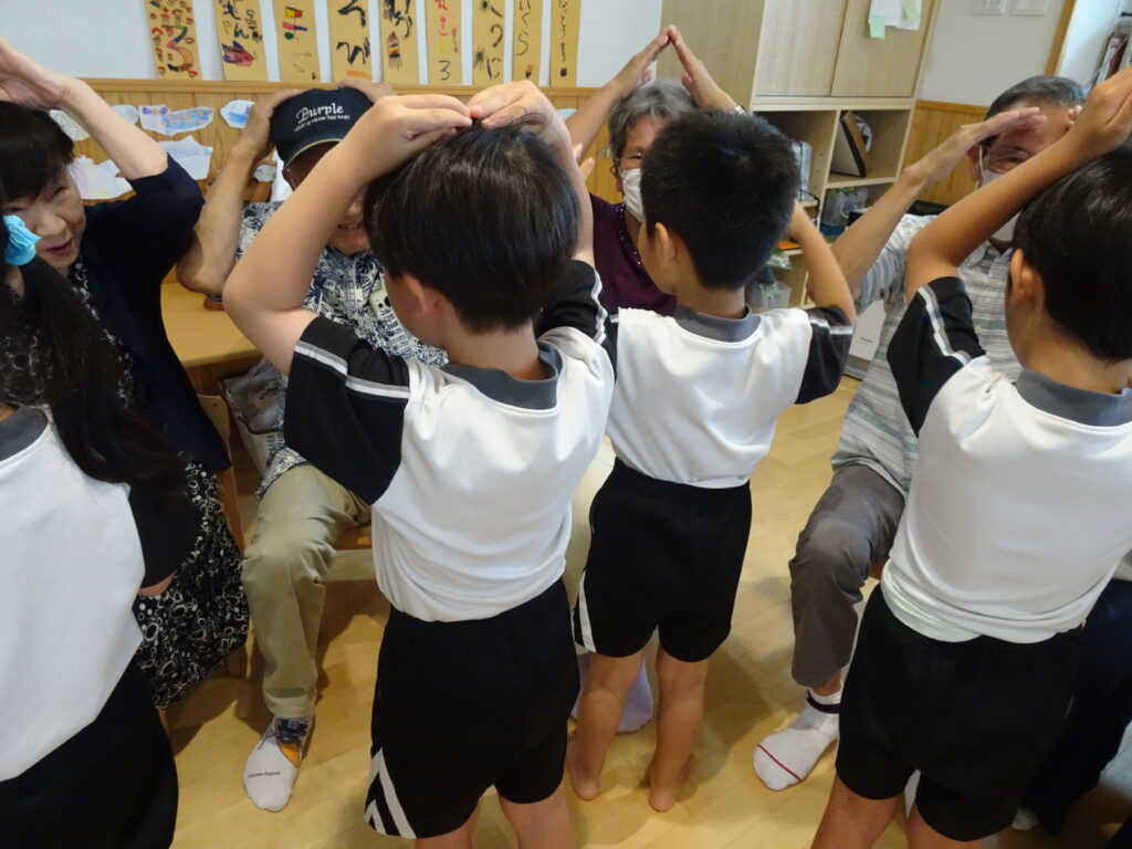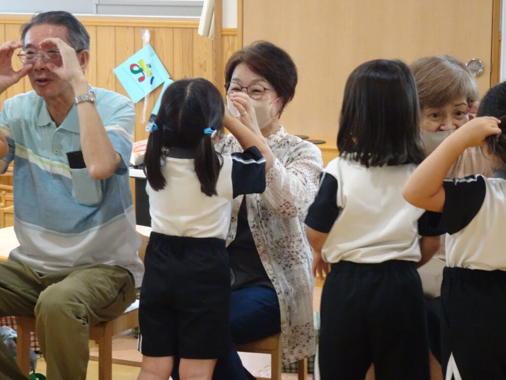 いつもと違った雰囲気に子どもたちは少々緊張気味でしたが、一緒に手遊びをしたり、昔ながらの伝承遊び(アルプス一万尺など)を行っていくうちに自分のお孫さん以外の子どもたちにも優しく笑顔で接してくださる、おじいちゃんおばあちゃんに対して親しみを感じ、子どもたちの緊張がほぐれていく様子がわかりました。