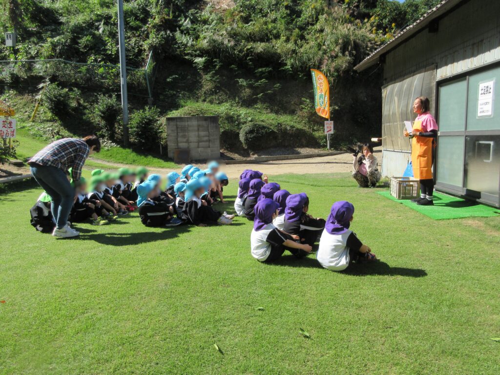 大きなバスに乗って1時間ほどでみかん園に到着し、大切に育てたみかんをどうやって取ったり食べたりするのかを農家の方にお聞きしているところです。みんな真剣なまなざしで聞いていました。