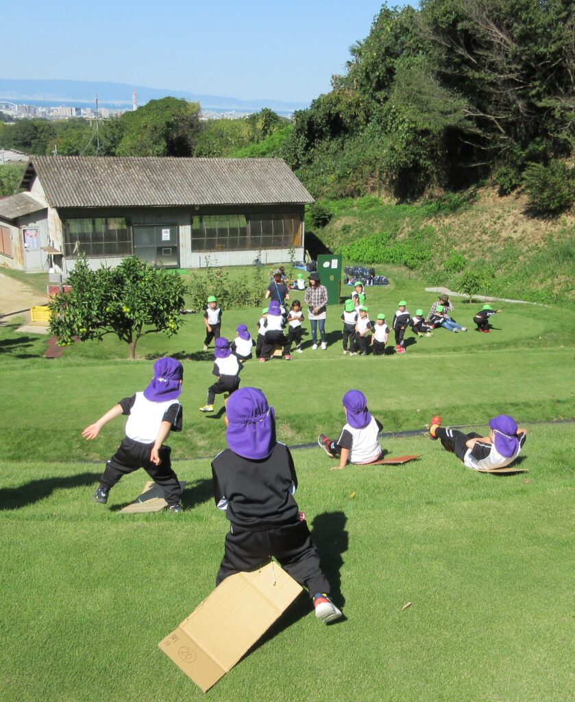 「2こたべた~」「3こたべたよ~」と嬉しそうに教えてくれる子どもたちですが、保護者の方が作ってくださったお弁当も待ち遠しく「お弁当の時間にしようか?」と話すと「やった~!!」と喜んで広場に行き、しっかりとお弁当を食べてくれていました。おなかが満たされたあとはみんなで芝すべり遊びへレッツゴー!!