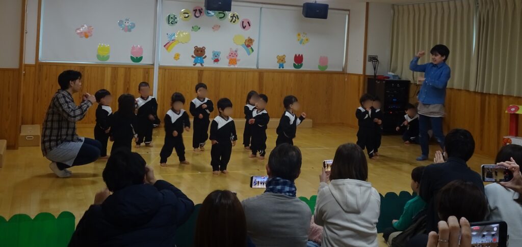 入園した頃は、初めての場所や人に不安で涙を見せていたお友だちもいましたが、今ではすっかり園生活に慣れ、指差しをしながら「これがいい」「こっちがしたい」と、自分の気持ちを一生懸命伝えてくれるようになりました。発表会では、体操や手遊び、たいこあそび、絵本など、楽しい内容が盛りだくさんでした。どの場面でも、子どもたち一人ひとりの成長が感じられ、思わず笑顔になるような微笑ましい姿がたくさん見られました。