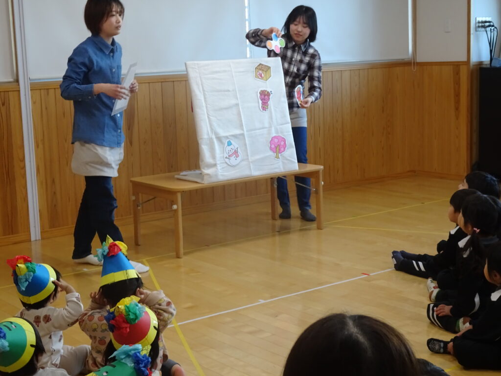 まずは全クラスが集まり、「節分ってなに?」というパネルシアターを見ながら、節分のお話をしました。