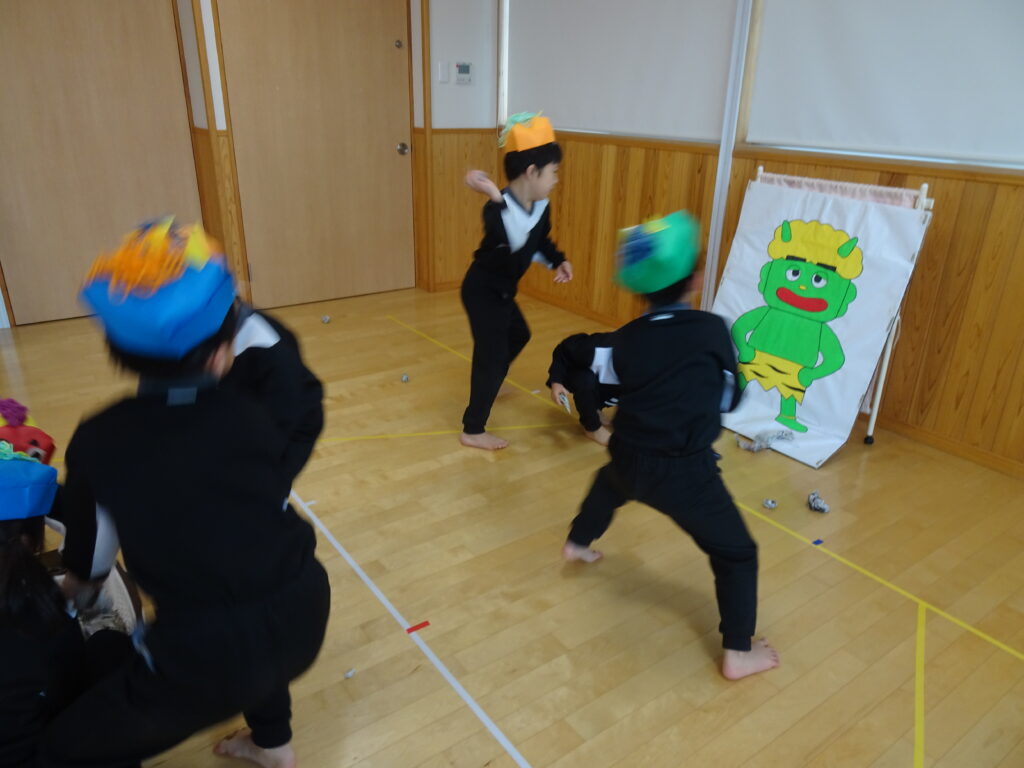 先生がボードの鬼を持って動かすと「まけないぞ」と力が入り、ワイワイしながら豆まきを楽しんでいました。