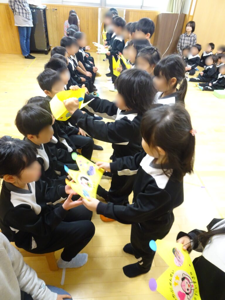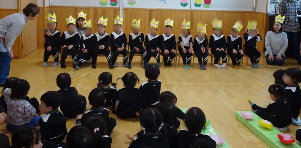 小さいクラスのお友だちからは、心のこもった歌のプレゼントや、みんなで作った冠の贈り物がありました。ゆり組の子どもたちは嬉しそうににこにこと受け取っていました。