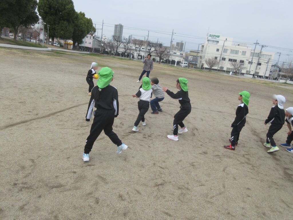 昼食後は広場でドッジボールを行い、楽しい時間を過ごしました。遊んでいるうちに、公園に来ていたお友だちも「一緒に遊びたい」と仲間に加わり、さらに賑やかなひとときとなりました。