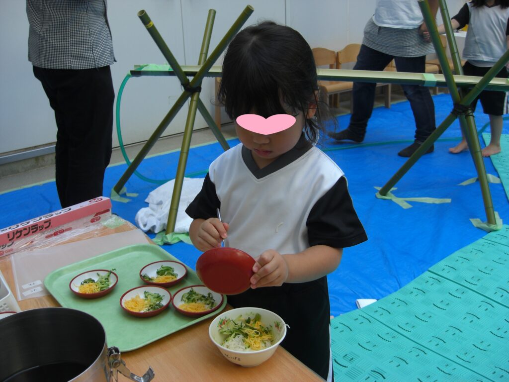 4・5歳児クラスは、園庭で風を感じながら、特別な食事タイム。
