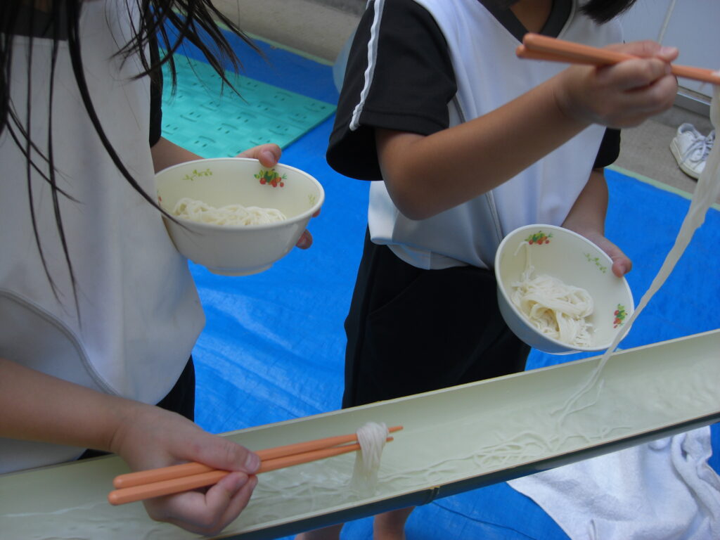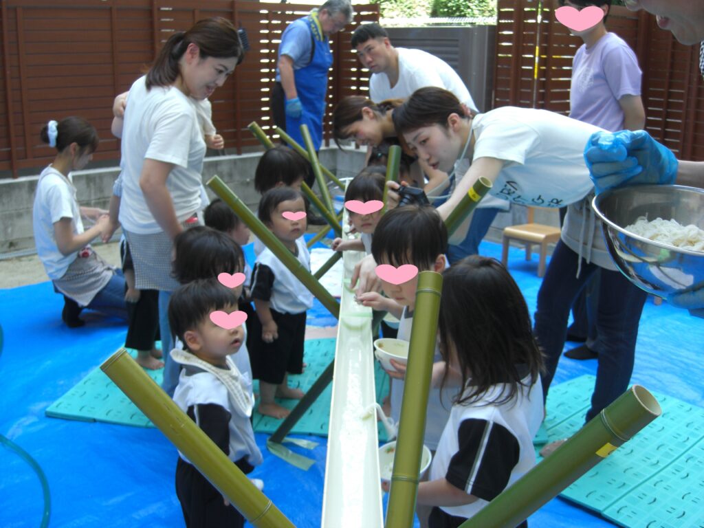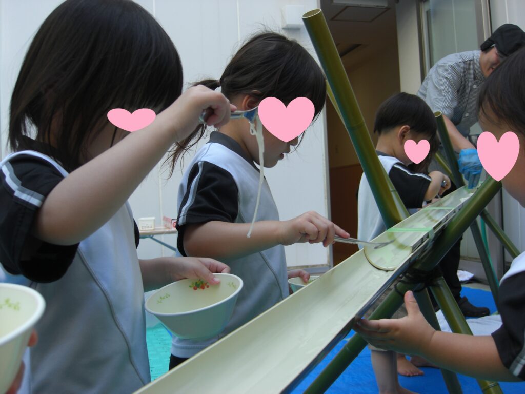 最後に年長児、5歳児クラスは、お箸を使って流しそうめんに挑戦!