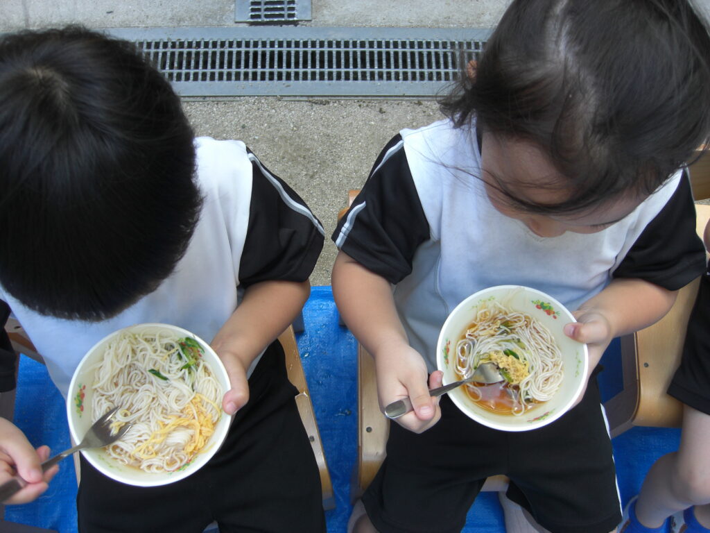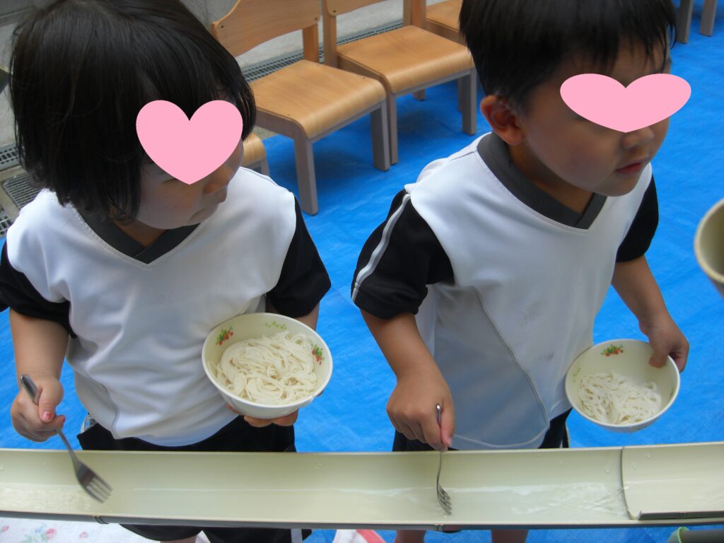 3歳児クラスは昨年の体験をしっかり覚えていて、「あそこから流れてくるで!」と目を輝かせながらフォークを構え、流れてくるそうめんを待ち構えては、次々とすくって楽しんでいました。
