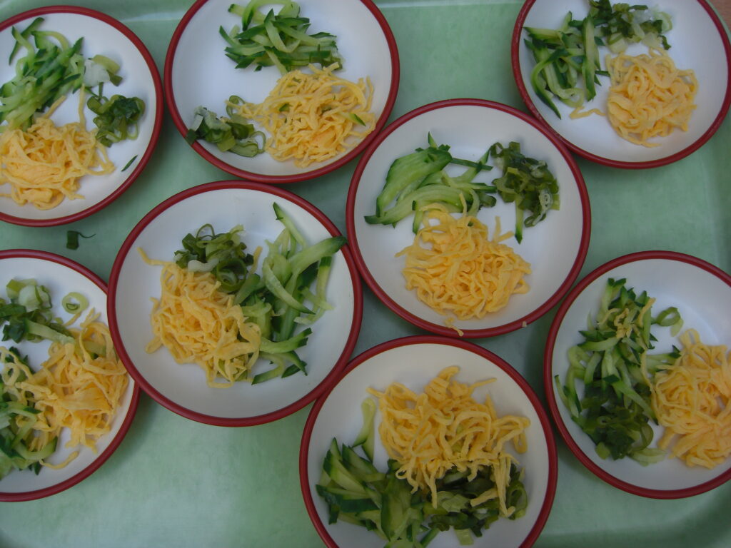 ネギ、きゅうり、卵を自分でのせて、「自分だけのそうめん」を楽しんでいました♪