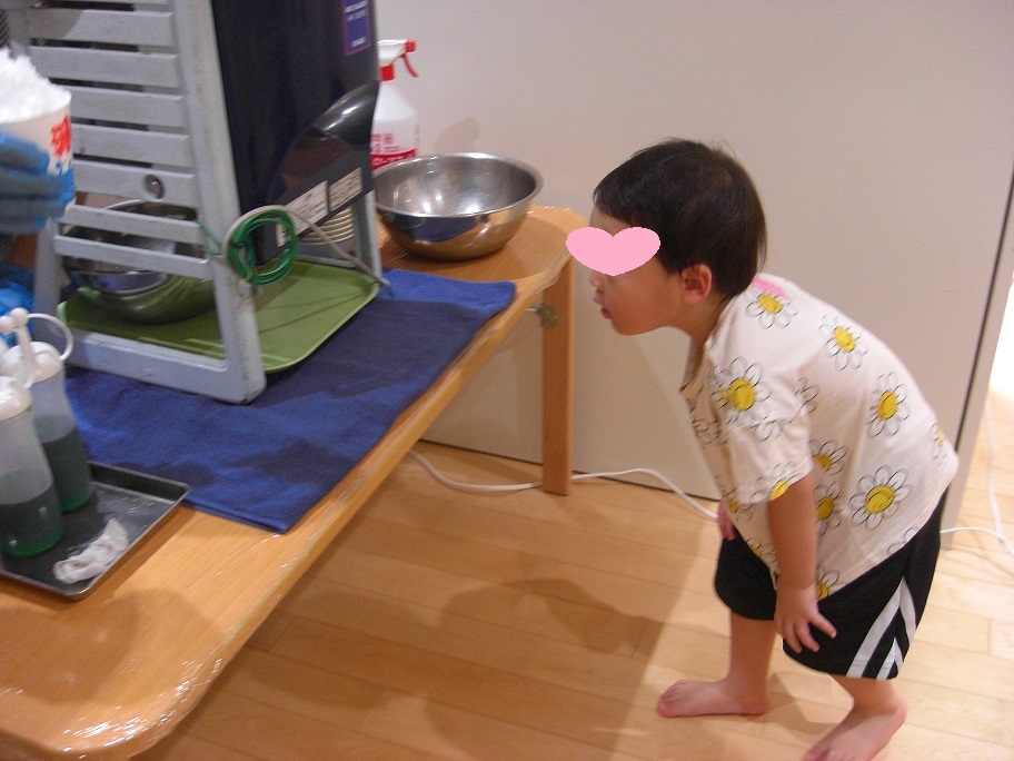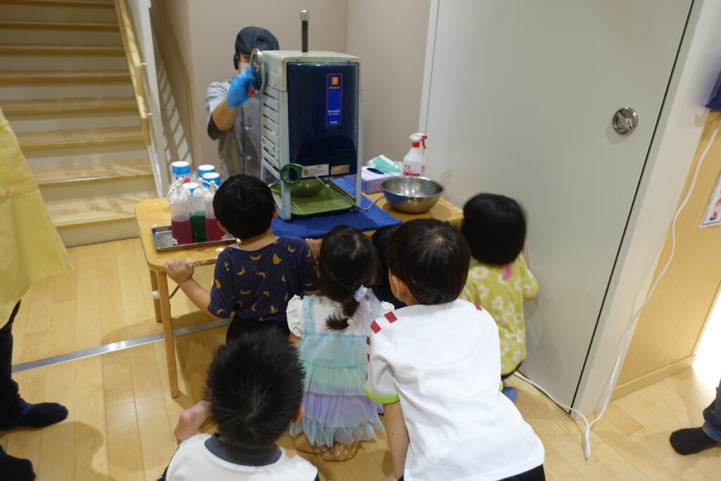 氷を削る音に耳を澄ませ、ゴロリと大きな氷が見えると「わぁ!おおきい!」と思わずかき氷機の中を覗き込むをお友だちもいました。
