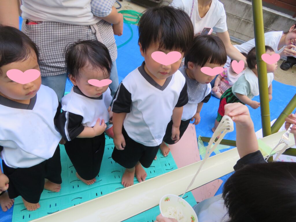 0・1歳児クラスは、園庭に出て、流れていくそうめんや年上のお兄さん・お姉さんの様子を見学しました。