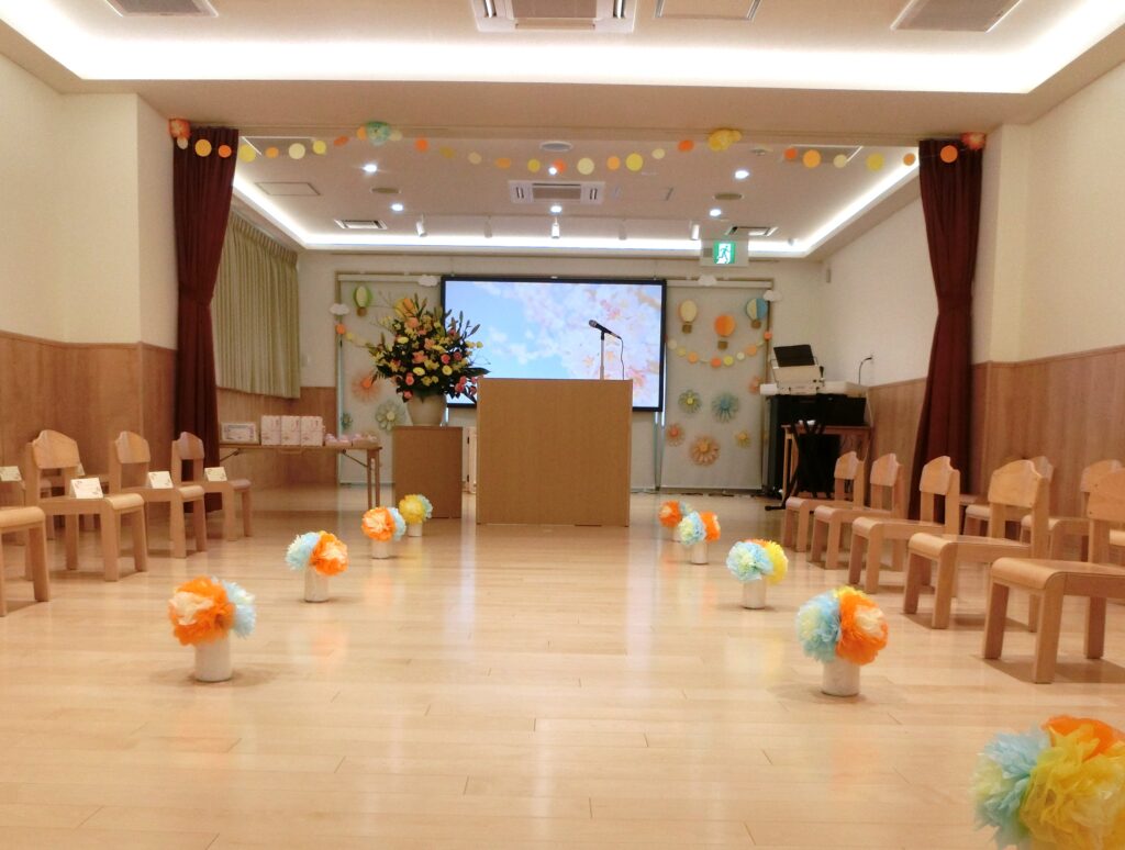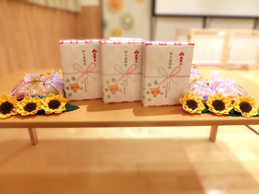 大好きなゆり組さんを、保育者みんなで心を込めて送り出したいという思いから、何日も前より会場の飾りやコサージュを一つひとつ丁寧に考え、準備してきました。