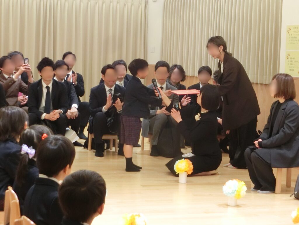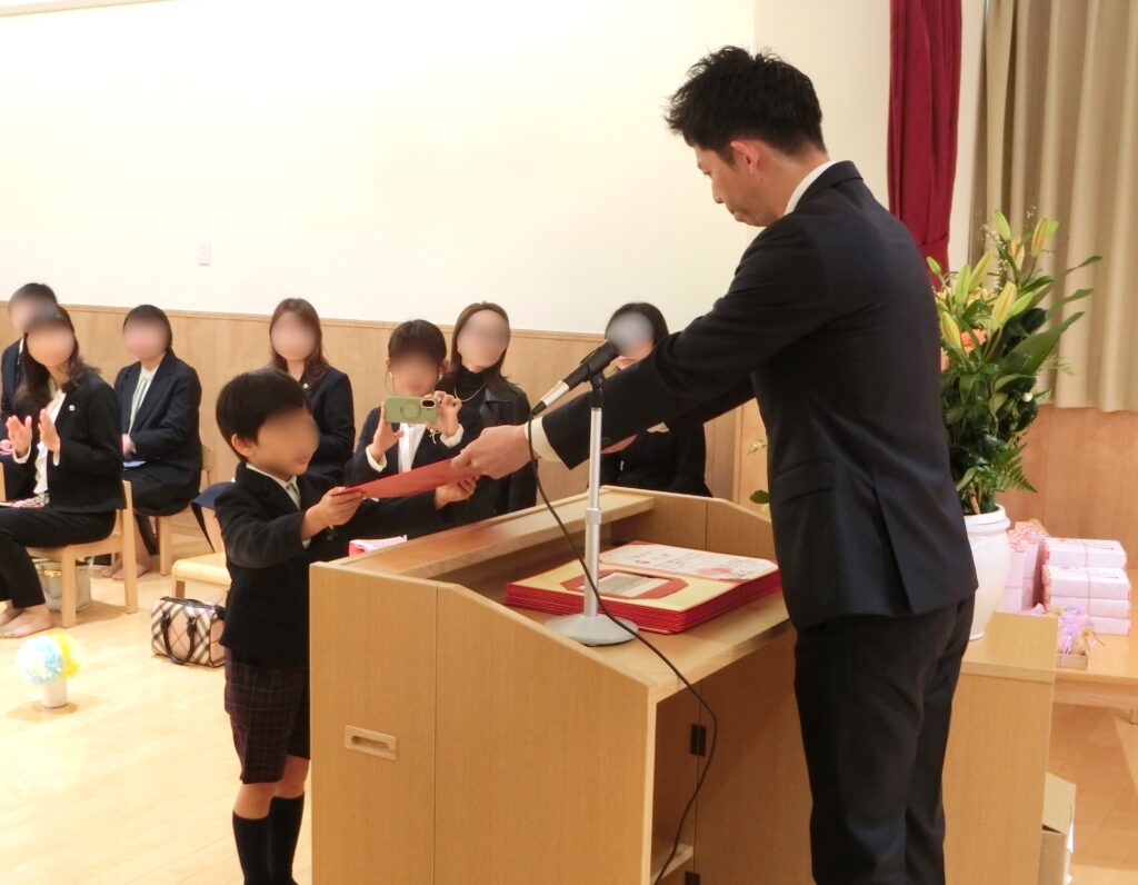 卒園証書授与では、園長先生の顔をまっすぐ見つめ、両手でしっかりと証書を受け取る姿がとても立派で、これまでの成長を感じる瞬間となりました。