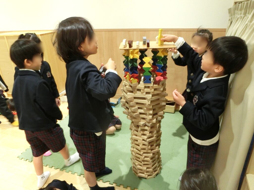 入園した当初は、目新しい玩具に囲まれ、体を動かして遊ぶことが大好きだった子どもたち。保育園の生活を積み重ねると、遊びを楽しむなかで、指先も器用になっていきました。また、遊びを通してルールや友だちとの関わりが育まれました。