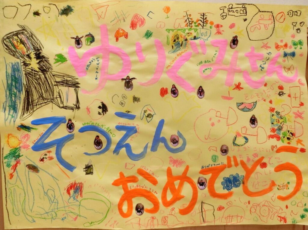 卒園式当日、子どもたちはお部屋の雰囲気や先生たちのいつもとは違う装いに、少し緊張した様子も見られました。しかし、ゆり組さんに憧れを抱くふじ組さん(4歳児)からのサプライズプレゼントが、壁の一角に飾られているのを見つけると、子どもたちの表情はやわらぎ、あたたかな笑顔が広がりました。