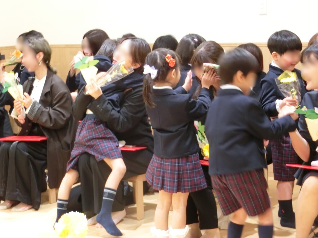 式のあとは、これまでの感謝の気持ちを込めて、保護者の方へ手作りのプレゼントを手渡しました。「ありがとう」の気持ちがあふれる時間となり、親子で見つめ合い、笑顔と涙が重なる、とても心温まるひとときとなりました。