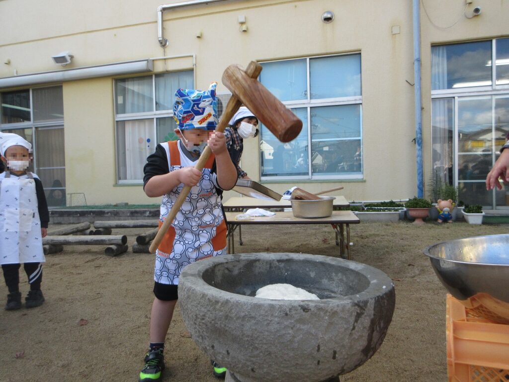 と子どもたちに話をすると「おもちつきやりたい」と意欲満々でした。